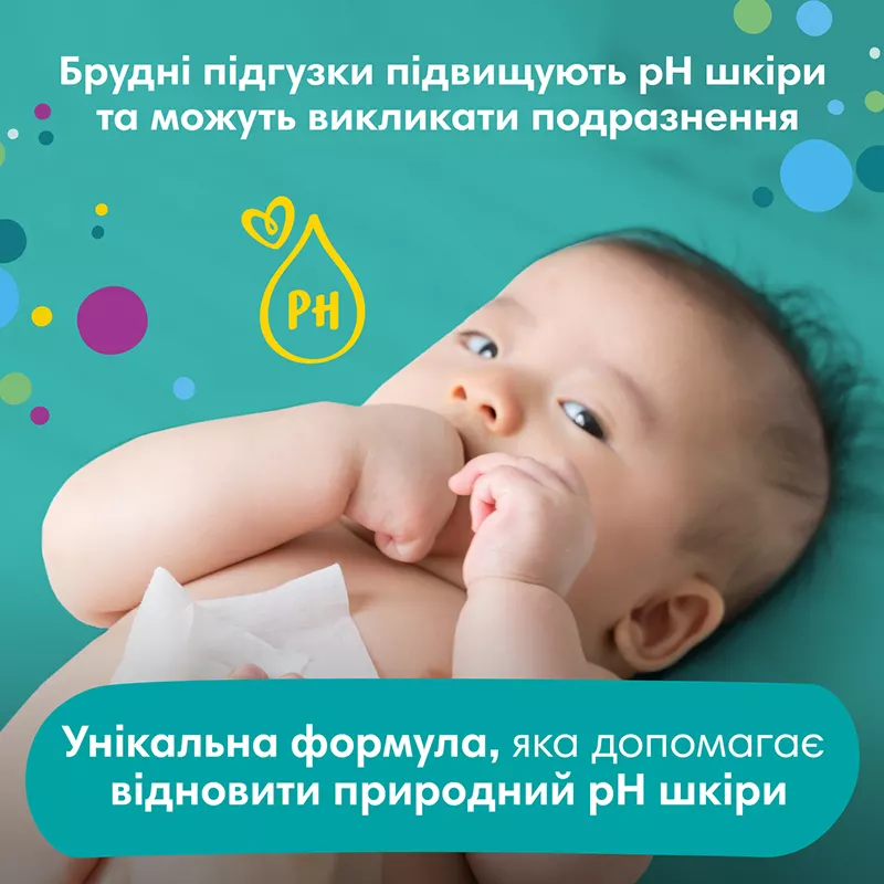 Ензими, що містяться у випорожненнях, порушують природний pH-баланс шкіри, підвищуючи ризик виникнення подразнень і висипки. Формула серветок Pampers підтримує природний рівень pH краще, ніж вата з