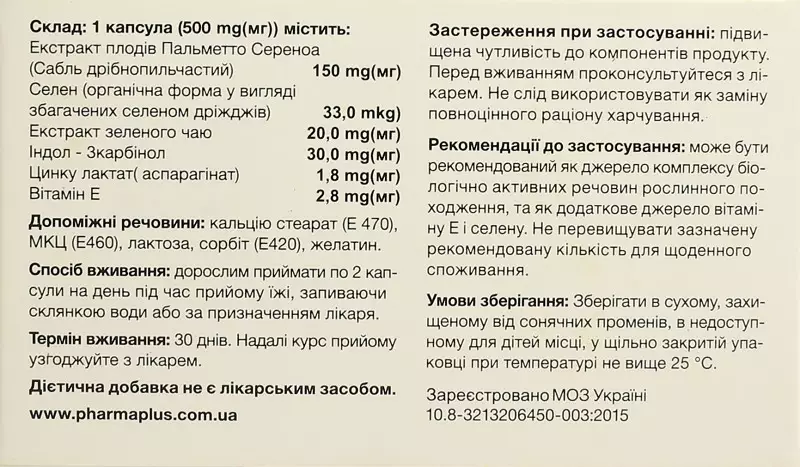 • Екстракт плодів Пальметто Сереноа (Сабаль дрібнопильчастий) – 150 мг