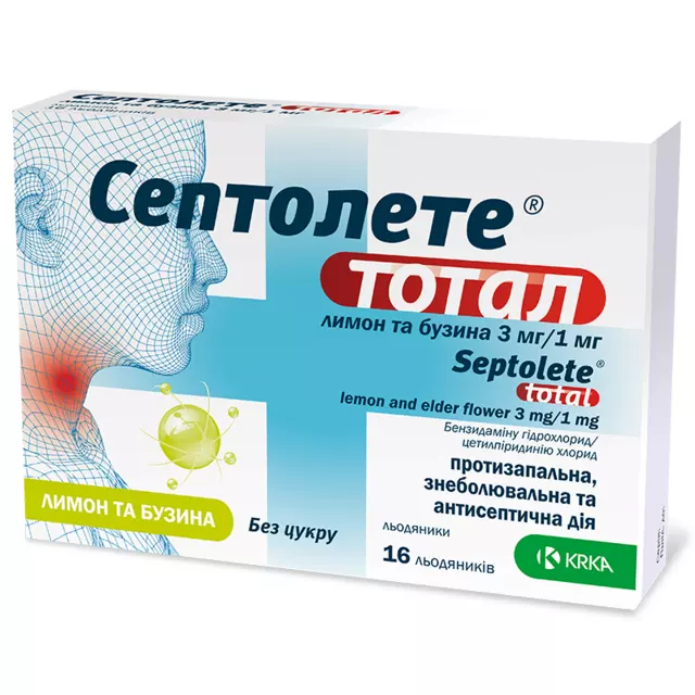 Септолете® тотал лимон та бузина містить натрію бензоат (E 211) та може помірно подразнити шкіру, очі та слизові оболонки.