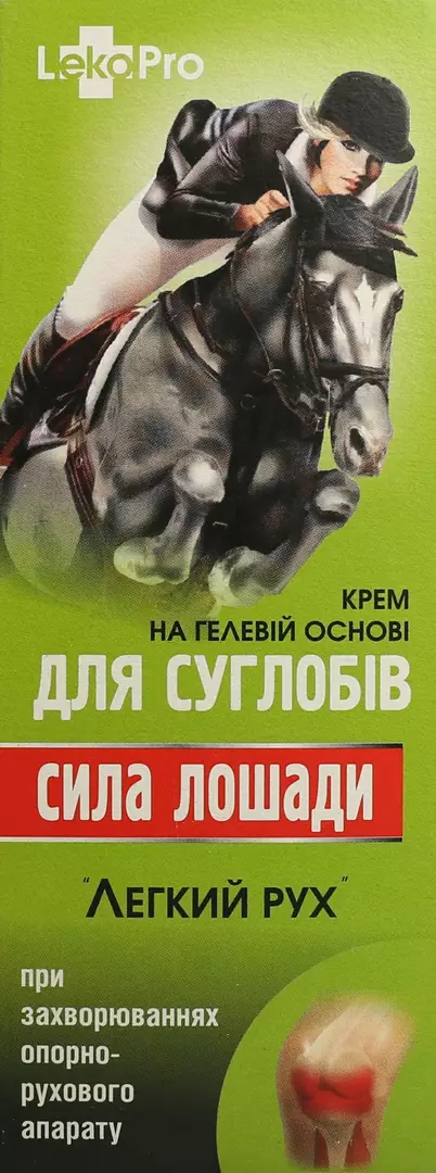 Крем-гель для суглобів "Сила Лошади" - це крем на травах, призначений для профілактики і лікування ушкоджень колін та інших ділянок тіла, що зазнають підвищене навантаження. Він розроблений таким чином, щоб концентрація містяться в ньому компонентів була достатньою для коня, але при цьому безпечною для людини. Цей крем для ніг створений на основі класичної рецептури, доопрацьованій і доповненої особливим поєднанням цілющих речовин. Тому він ефективний і як крем для колін, і як засіб зміцнення зв'язок.