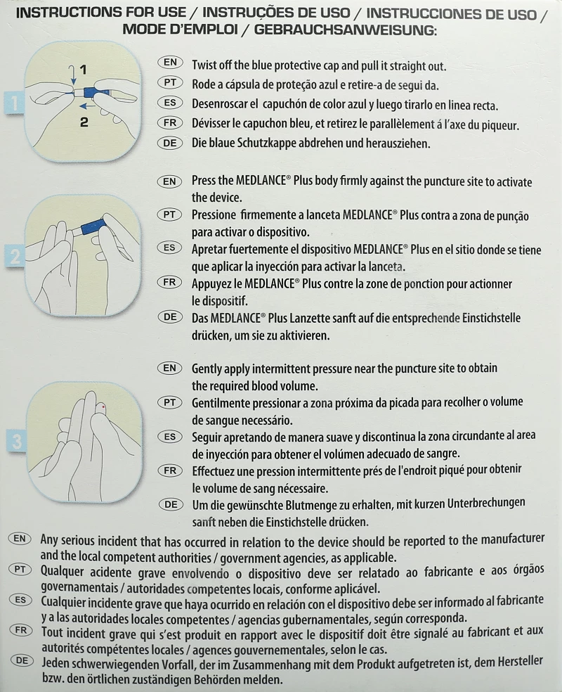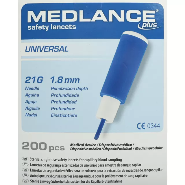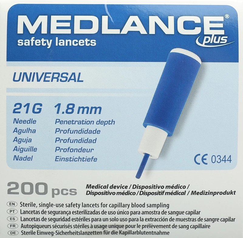 Ланцетом Medlance Plus Universal зручно брати капілярну кров для вимірювання рівня глюкози в крові. Голки мають калібрування оптимальним діаметром для проколу 1,8 мм для середнього кровотоку. Корпус самого приладу влаштований так, щоб голка постійно перебувала в захищеному стані і не могла заподіяти сторонніх пошкоджень. Конструкція передбачає одноразове використання, після якого відбувається її саморуйнування. Всі голки стерилізовані іонізуючим випромінюванням.