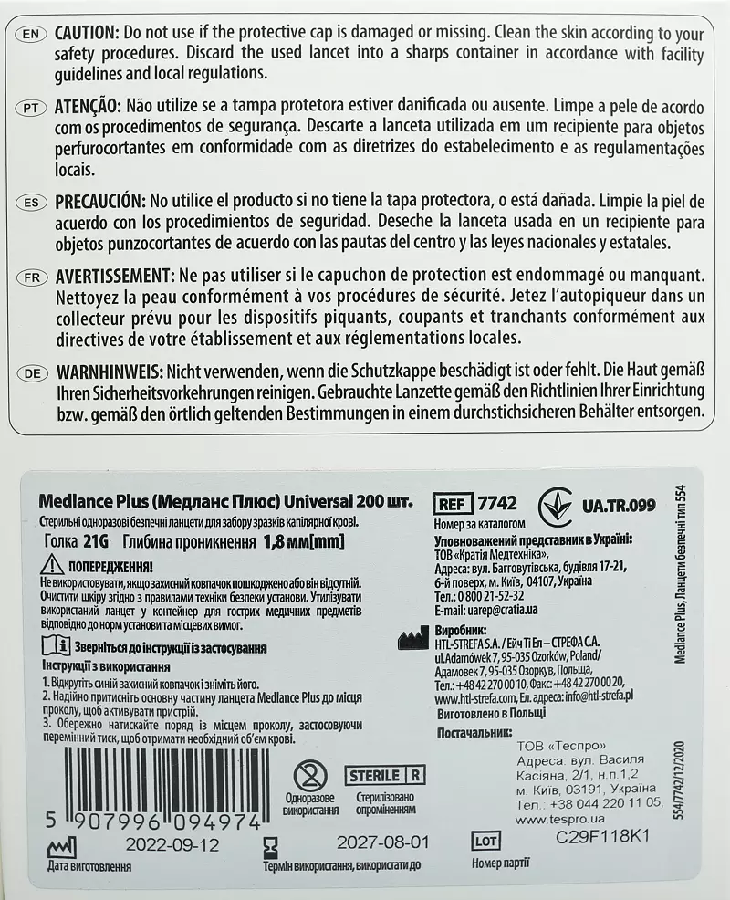 Скарификатор (ланцет) Медланс плюс Юниверсал (Medlance plus Universal) глубина прокола 1,8 мм размер 21G 200 шт, HTL-Strefa