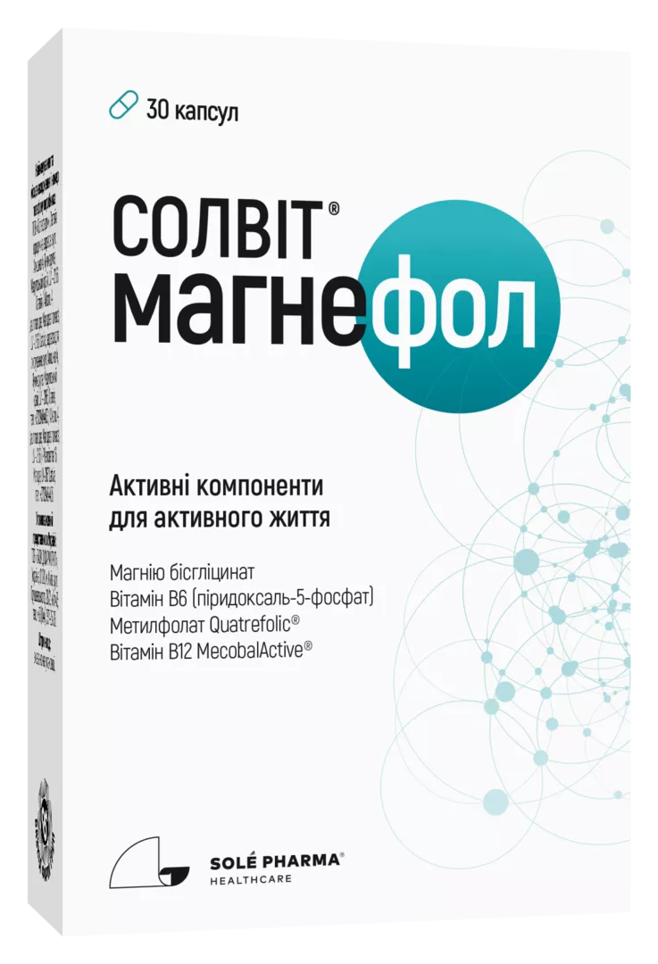 Солвіт® МагнеФол рекомендований до застосування для попередження та усунення дефіциту магнію, вітаміну В6, фолієвої кислоти та вітаміну В12 (ізольованому чи поєднаному з іншими станами). Сприяє нормалізації функціонування нервової та серцево-судинної системи при надмірних фізичних і психічних навантаженнях, підвищеній втомлюваності або слабкості, порушеннях сну, дратівливості, підвищеній збудливості, тривожності, м’язових судомах. Покращує пам’ять та запам’ятовування. Має м’які заспокійливі властивості. Приймає участь у нормалізації синтезу всіх клітин крові (включаючи еритроцити) та попередженню розвитку тромбозів. Перед застосуванням рекомендована консультація з лікарем.
