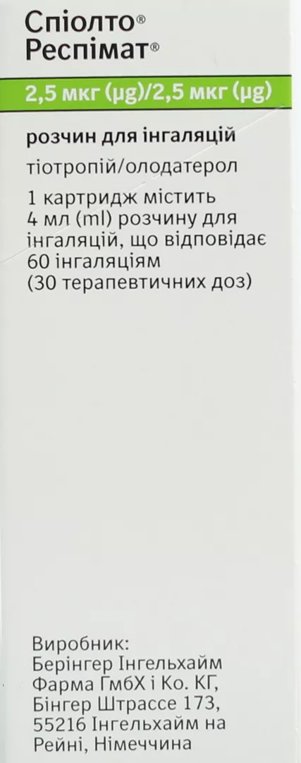Спиолто Респимат раствор для ингаляций 2,5 мкг/2,5 мкг+ картридж с ингалятором Респимат 4 мл 60 доз, Boehringer Ingelheim