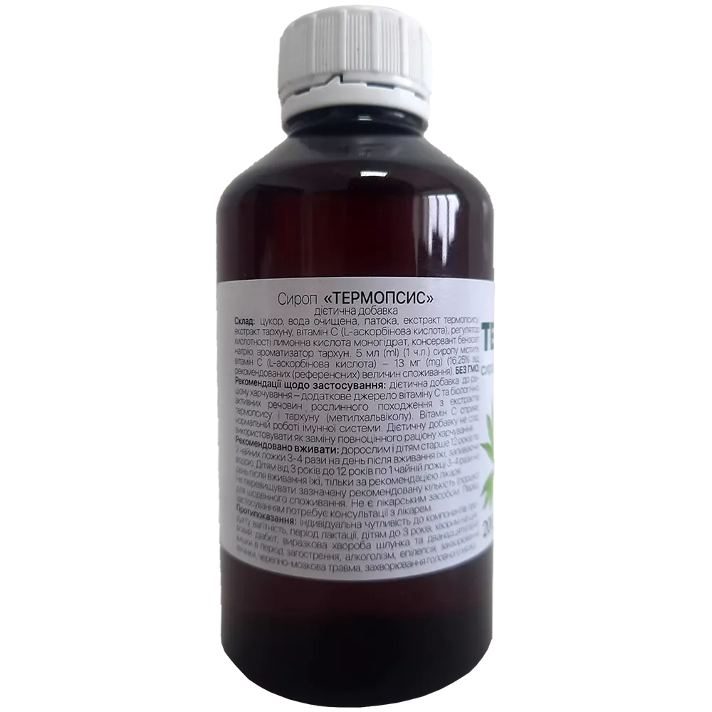 Склад: цукор, вода очищена, патока, екстракт термопсису, екстракт тархуну, аскорбінова кислота, лимонна кислота, консервант бензоат натрію, ароматизатор. БЕЗ ГМО.