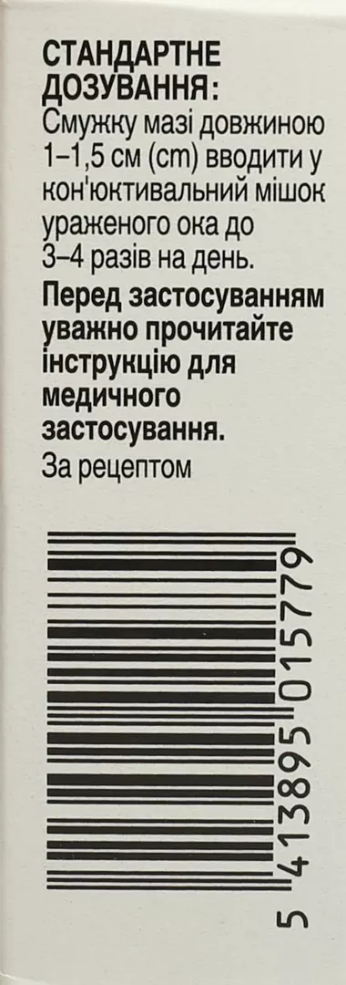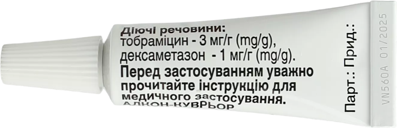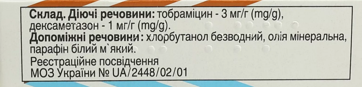 1 г мазі містить тобраміцину 3 мг та дексаметазону 1 мг;
