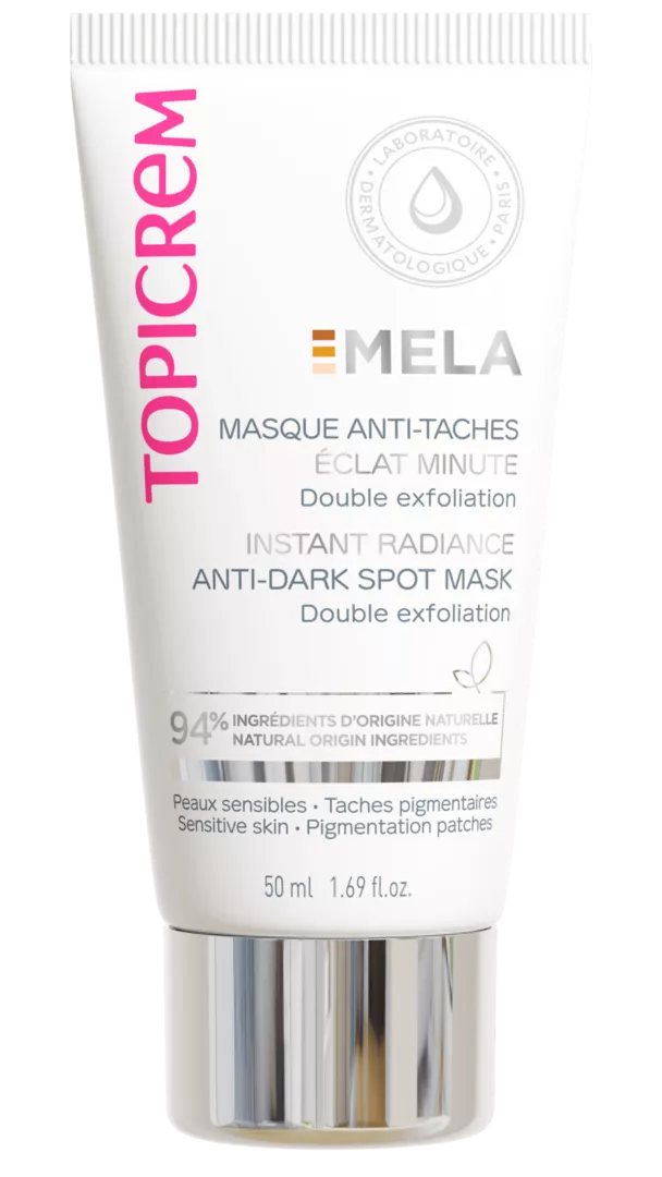 Маска для чутливої шкіри, яка поєднує в собі ефективну дію проти темних плям та подвійну ексфоліацію (пілінг – скраб) для надання миттєвого ефекту сяяння шкіри за 10 хвилин. Завдяки комплексу MELA (екстракт водоростей, ніацинамід), глюконолактону та частинкам бамбука ця подвійна відлущувальна маска забезпечує ефект нової шкіри та миттєве посилення сяйва. Темні плями зменшуються, текстура шкіри покращується. Колір обличчя рівний і сяючий. Її формула містить 94% інгредієнтів натурального походження. Має свіжу та приємну текстуру, що легко розподіляється та змивається. Маска MELA видаляє всі типи плям, навіть давні; відновлює сяючий колір обличчя та вирівнює тон шкіри, зволожуючи її! Користувачі: Підлітки, дорослі. нанесіть засіб товстим шаром на все обличчя та шию, уникаючи області навколо очей, потім залиште діяти на 10 хвилин. Змочіть і помасажуйте круговими рухами, щоб створити скраб, а потім ретельно змийте.