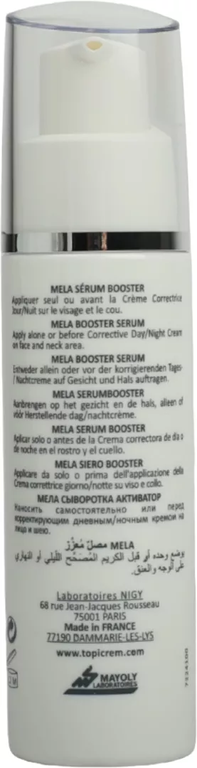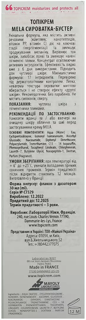 Показання: чутлива шкіра з пігментними плямами. Спосіб застосування: Наносити вранці та / або ввечері на очищену шкіру обличчя та шиї перед застосуванням крему MELA. Склад: AQUA (WATER) : EAU, CYCLOPENTASILOXANE, ISONONYL ISONONANOATE, ASCORBYL GLUCOSIDE, NIACINAMIDE, DIPHENYL DIMETHICONE, POLYACRYLAMIDE, TROMETHAMINE, C13 – 14 ISOPARAFFIN, PHENOXYETHANOL, TOCOPHERYL LINOLEATE, CHLORPHENESIN, LAURETH–7, BUTYLENE GLYCOL, NONAPEPTIDE-1, DEXTRAN, PARFUM (FRAGRANCE). Умови зберігання: при температурі від +6˚ до +25˚С, уникати попадання прямих сонячних променів. Термін придатності після відкриття становить 12 місяцівВиготовлено у Франції