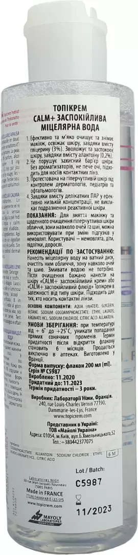 Рекомендації по застосуванню: Нанесіть міцелярну воду на ватний диск, очистіть ним обличчя, зону навколо очей та шию. Змивати водою не потрібно. Після очищення бажано нанести на шкіру «CALM+ заспокійливий крем» або «CALM+ заспокійливий флюїд» Топікрем в залежності від типу шкіри. Підходить для тих, хто носить контактні лінзи.