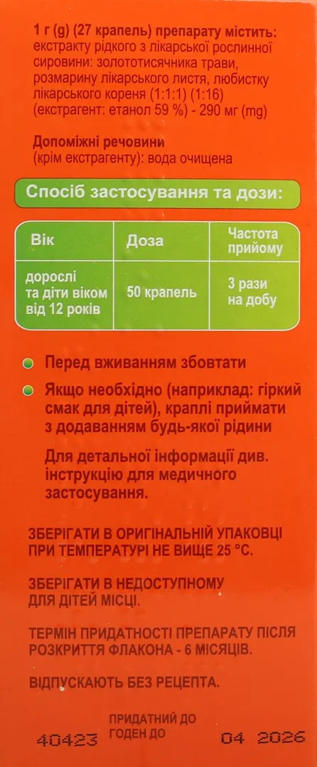діючі речовини: 1г (27 крапель) препарату містить екстракту рідкого з лікарської рослинної сировини: золототисячника трави (Herba Centaurii), розма­рину лікарського листя (Folia Rosmarini officinalis), любистку лікарського кореня (Radix Levistici officinalis) (1:1:1) (1:16) (екстрагент: етанол 59 %) – 290 мг;
