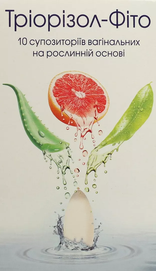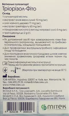 Склад. 1 супозиторій містить: активні речовини - екстракт алое віра сухий 10 мг, олія чайного дерева 11 мг, екстракт грейпфрута 60 мг, гіалуронова кислота (у вигляді натрієвої солі) 5 мг; допоміжні речовини – тригліцериди до 2 г. Показання для використання. Вагінальні супозиторії ТРІОРІЗОЛ-ФІТО призначені для місцевого застосування з метою полегшення станів, що супроводжуються печінням, свербежем та/або почервонінням піхви. Засіб рекомендується застосовувати як допоміжний засіб при захворюваннях піхви бактеріального (наприклад, вульвовагініт) та грибкового (наприклад, кандидоз) походження. З профілактичною метою засіб рекомендується застосовувати у пацієнтів із частими вагінальними інфекціями з метою зниження частоти рецидивів, для профілактики внутрішньоутробного інфікування плода та плаценти, для покращення еластичності пологових шляхів з метою зниження травматизму (розривів) м'яких тканин під час пологів. Властивості. Екстракт алое віра покращує клітинний метаболізм, трофіку та регенерацію тканин, підвищує загальну неспецифічну резистентність та стійкість слизових оболонок до дії ушкоджуючих агентів. Алое віра також має гідратуючу дію, нормалізує рН статевих шляхів, сприяє зростанню лактофлори.Олія чайного дерева виявляє високу протимікробну активність, здатна стимулювати регенерацію пошкодженої шкіри, сприяє епітелізації ран.