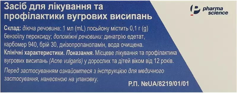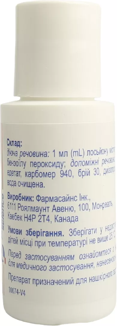 діюча речовина: 1 мл лосьйону містить 0,1 г бензоїлу пероксиду;