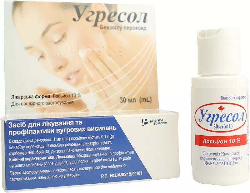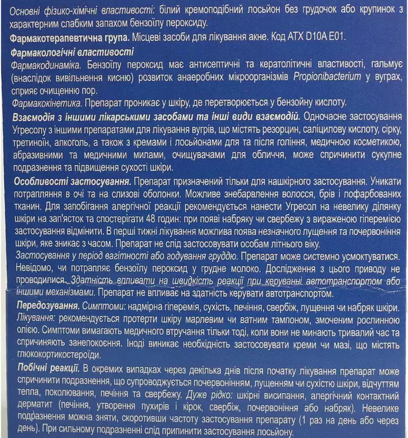 Благодаря антисептическим свойствам бензоила пероксида лосьон «Угресол» помогает уменьшить количество бактерий Propionibacterium acnes, которые вызывают воспаление и образование угрей. Показаниями для использования средства является локальное лечение и профилактика угревых высыпаний (Acne vulgaris).