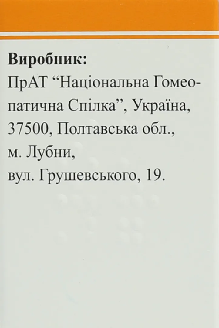 Передозування. У більшості випадків не призводить до негативних наслідків та не потребує антидотної терапії, але у осіб з гіперчутливістю до компонентів препарату можливе посилення проявів побічних реакцій. Побічні реакції. Можливі реакції гіперчутливості. Термін придатності. 3 роки. Умови зберігання. Зберігати у недоступному для дітей місці, в оригінальній упаковці, при температурі не вище 250 С. Упаковка. По 10 г гранул у пеналі полімерному або флаконі з кришкою, у картонній пачці з маркуванням українською мовою. Категорія відпуску. Без рецепта. Виробник/заявник ПрАТ «Національна Гомеопатична Спілка» Місцезнаходження виробника та адреса місця провадження його діяльності.ПрАТ «Національна Гомеопатична Спілка».