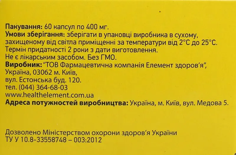 Форма випуску. 60 капсул в упаковці. Умови зберігання. Зберігати в упаковці виробника в сухому, захищеному від світла приміщенні при температурі від 2°С до 25°С. Зберігати у недоступному для дітей місці. Термін придатності. Термін придатності 2 роки із дати виготовлення. Виробник. ТОВ "Елемент здоров'я", Україна, 03062, м. Київ, вул. Естонська, буд. 120.Увага! Інструкція до препарату на сайті має інформаційне значення. Перед застосуванням ознайомтесь з інструкцією виробника!