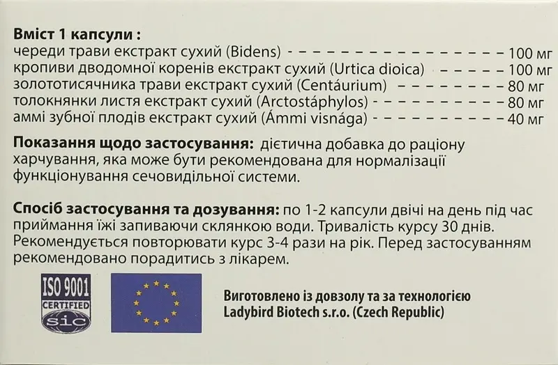Склад. 1 капсула містить стандартизовані рослинні екстракти: череди трави екстракт сухий (Bidens) 100 мг, кропиви дводомного коріння екстракт сухий (Urtica dioica) 100 мг, золототисячника трави екстракт сухий (Centáurium) 80 мг, мучниці листя екстракт сухий (Arctostáphylos) 80 мг, аммі зубний плодів екстракт сухий(Ámmi visnága) 40 мг.