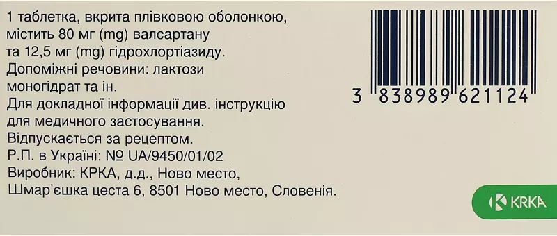 Склад:діючі речовини: 1 таблетка, вкрита плівковою оболонкою, містить 80 мг валсартану та 12,5 мг гідрохлортіазиду або 160 мг валсартану та 12,5 мг гідрохлортіазиду, або 160 мг валсартану та 25 мг гідрохлортіазиду;