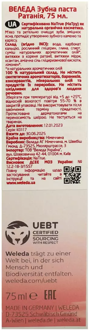 Веледа (Weleda) Ратания зубная паста 75 мл, Weleda