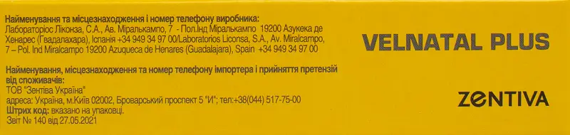 Виробник Найменування та місцезнаходження і номер телефону виробника: Лабораторіос Ліконза, С.А., Ав. Міралькампо, 7 - Пол.Інд Міралькампо 19200 Азукека де Хенарес (Гвадалахара), Іспанія +34 949 34 97 00/Laboratorios Liconsa, S.A., Av. Miralcampo, 7 – Pol. Ind Miralcampo 19200 Azuqueca de Henares (Guadalajara), SpainНайменування, місцезнаходження та номер телефону імпортера і прийняття претензій від споживачів: ТОВ "Зентіва Україна" адреса: Україна, м. Київ 02002, Броварський проспект 5 "И";