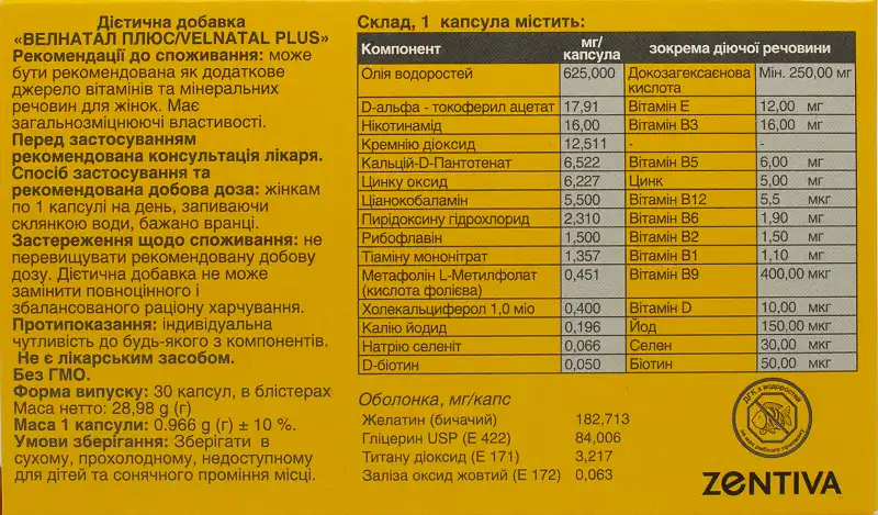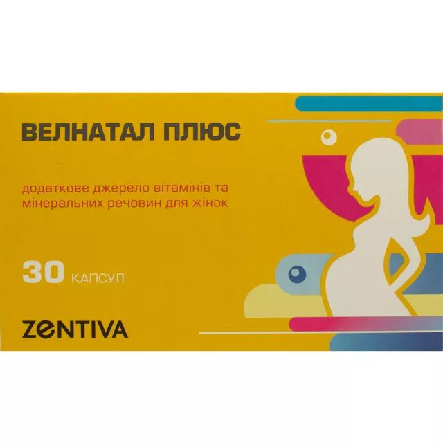 Це комплекс важливих вітамінів, мінералів та мікроелементів, підібраних спеціально відповідно до потреб жінок в період планування вагітності, а також протягом вагітності та годування груддю. Велнатал Плюс також підходить жінкам, які відчувають розумові та фізичні навантаження, стрес, при недостатньому і незбалансованому харчуванні та після перенесених захворювань.