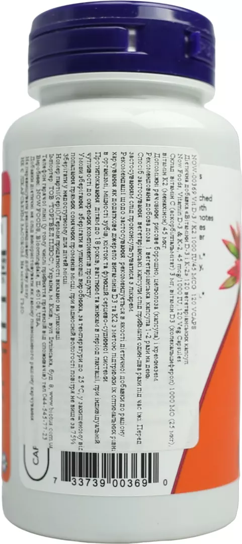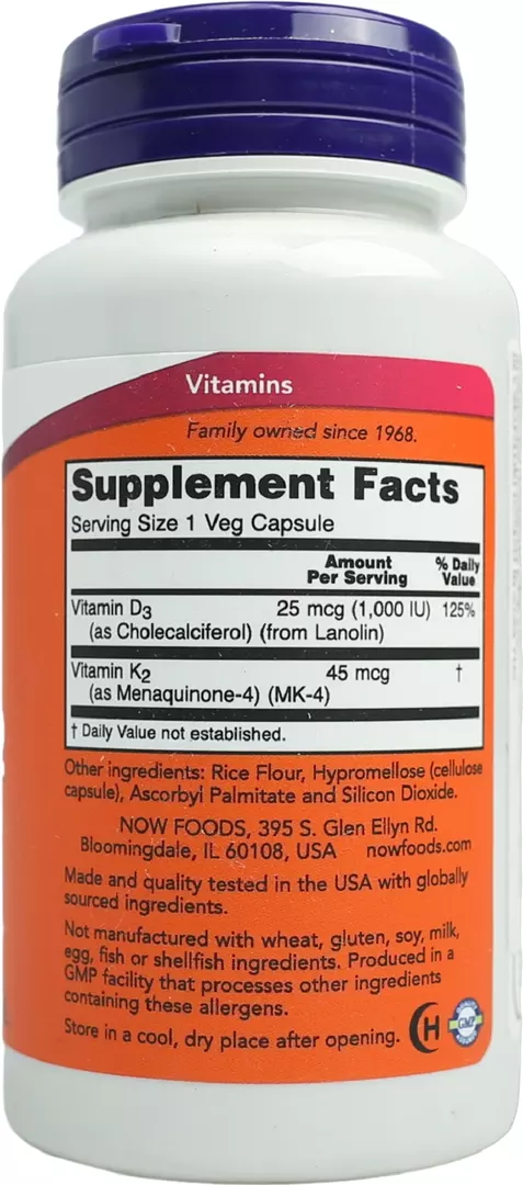 Цей продукт NOW поєднує в собі дві поживні речовини, роль яких у підтримці здоров'я кісток, зубів і серцево-судинної системи ретельно досліджувалася. Вітамін D3 сприяє транспортуванні і засвоєнню кальцію в організмі. Недавні дослідження показують, що вітамін D3 грає важливу роль в дії інсуліну і метаболізмі глюкози, а також сприяє зміцненню імунітету. Вітамін K важливий для формування здорових і сильних кісток. Функція вітаміну K для здоров'я артерій полягає в тому, що він сприяє нормальному обміну кальцію в структурах судин. Вітамін K2 являє собою готову активну і біодоступну форму вітаміну K.
