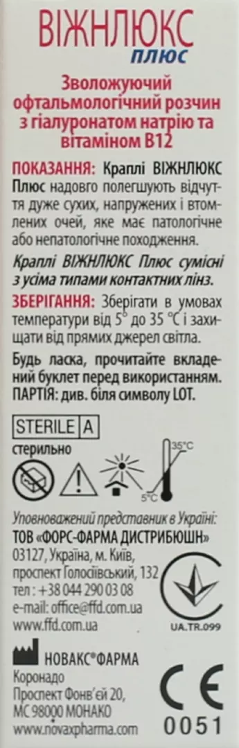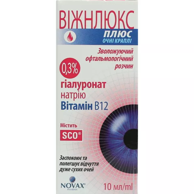 Капли ВИЖНЛЮКС ПЛЮС надолго облегчают ощущение очень сухих, напряженных и усталых глаз, которые возникают как при патологических, так и непатологических состояниях. Капли ВИЖНЛЮКС ПЛЮС защищают клетки от окислительного повреждения свободными радикалами, и заменяют местное низкое содержание питательных веществ в слезах.
