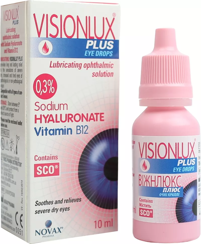 Капли ВИЖНЛЮКС ПЛЮС — это освежающий, ревитализирующий и увлажняющий офтальмологический раствор, содержащий гиалуронат натрия 0,3%, полученный путём ферментации, неживотного происхождения. Действие гиалуроната натрия оптимизируется и удлиняется синергическим действием P-Plus ™.