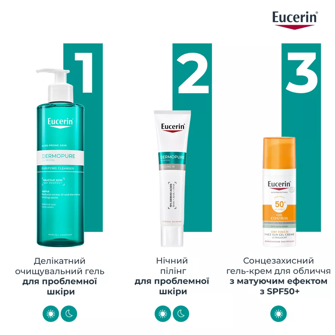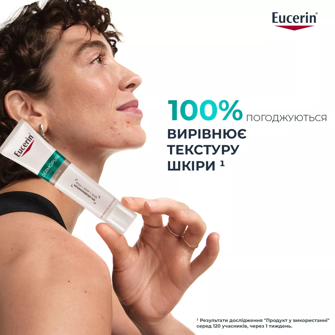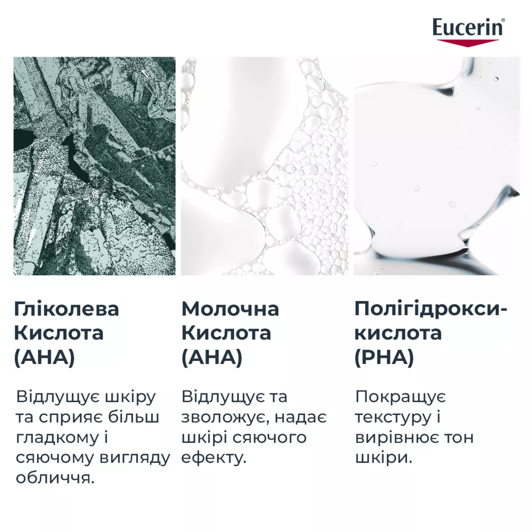 Цей продукт містить альфа-гідроксикислоти, які можуть підвищити чутливість вашої шкіри до сонця та ймовірність сонячних опіків. Тому ми рекомендуємо вам обмежити перебування на сонці під час використання цього продукту та протягом тижня після. У цей період і після нього обов’язково вранці наносите сонцезахисні засоби. Спробуйте Eucerin сонцезахисний гель-крем з матуючим ефектом SPF 30 або 50+.