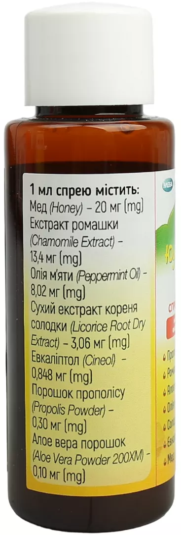 Інгредієнти : етиловий спирт, гліцерин, підсолоджувач (сорбіту 70% розчин), зволожувач (макроголгліцерол гідроксистеарат 40), мед, екстракт ромашки, стабілізатор (пропіленгліколь), олія м'яти, ментол, сухий екстракт кореня солодки (локриця), підсолоджувач (сукралоза), консервант (сорбат калію), регулятор кислотності (лимонна кислота безводна), евкаліптол, порошок прополісу, апельсиновий ароматизатор, алое вера порошок, вода очищена.